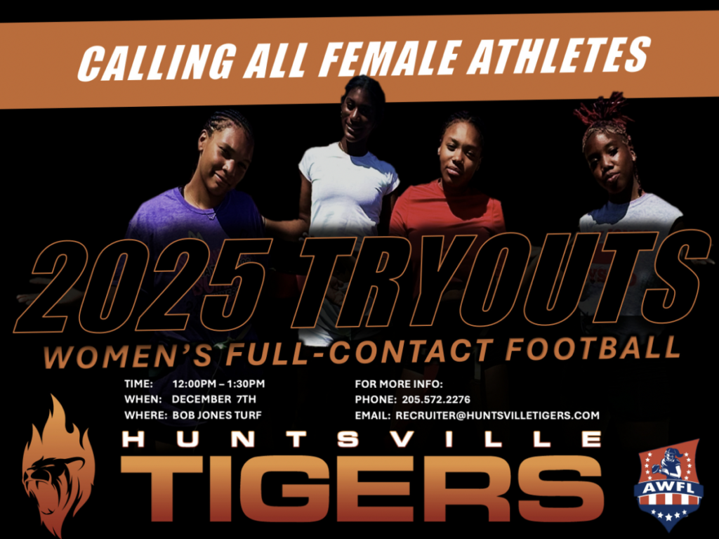The Huntsville Tigers are preparing for the 2025 season and are seeking new players to strengthen their team. Known for their fierce competitiveness and team spirit, the Tigers invite women passionate about football to step onto the field and showcase their talents. Tryouts Schedule The team will hold tryouts on Saturday, December 7, […]
