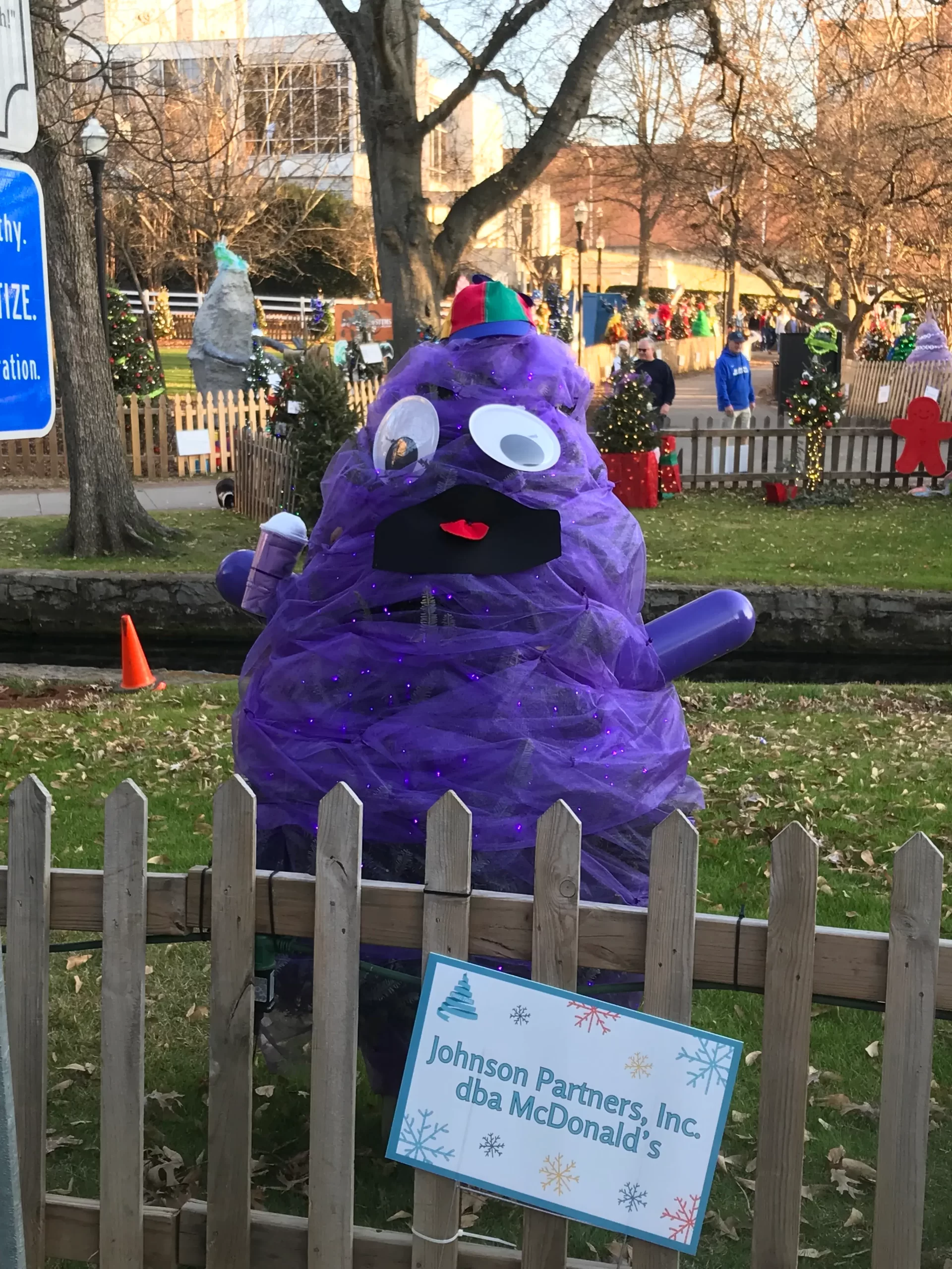 Once you cross to the other side, you encounter both the canal and the park’s namesake along with trees as far as the eye can see. One of the first is sponsored by The University of Alabama at Huntsville and their mascot Charger Blue, soon followed by a likeness of McDonald’s favorite Grimace.